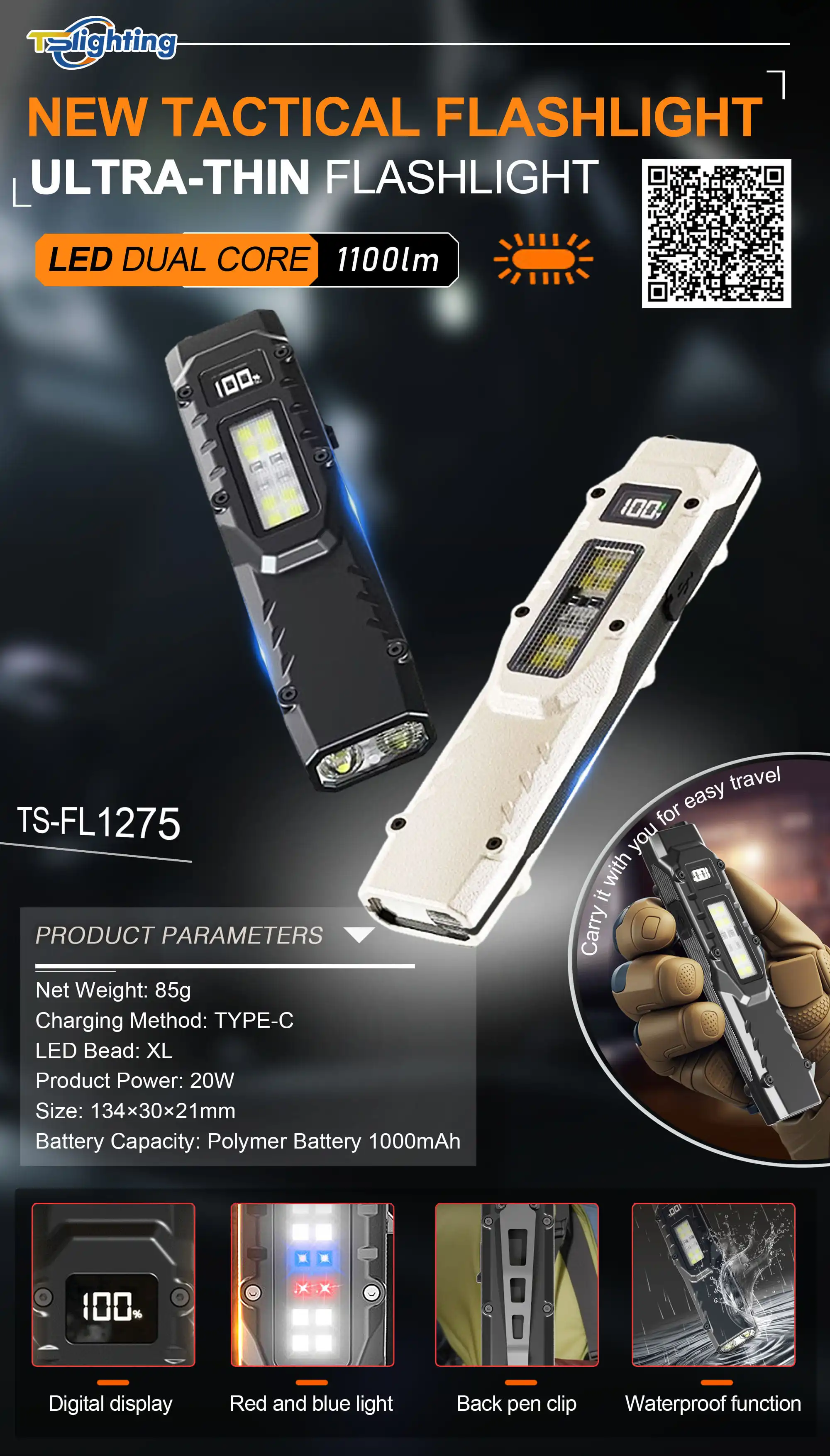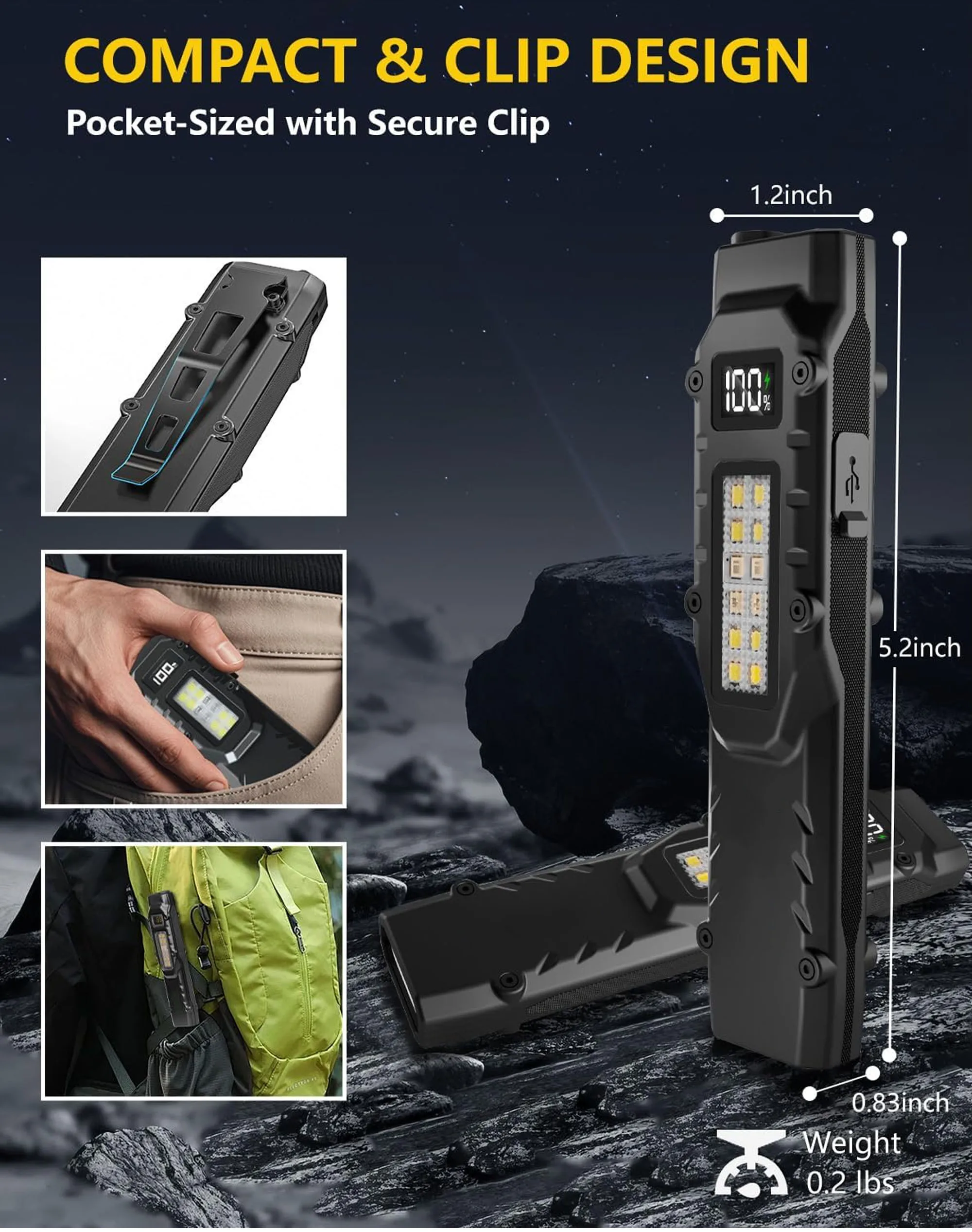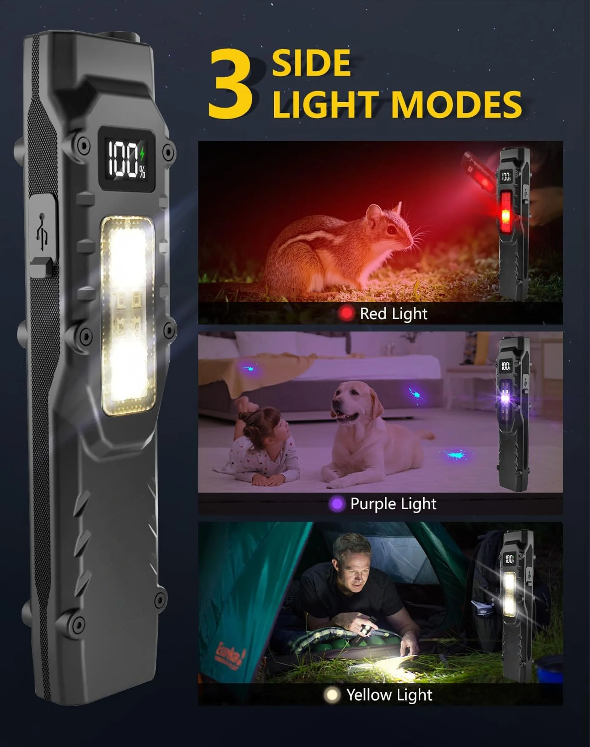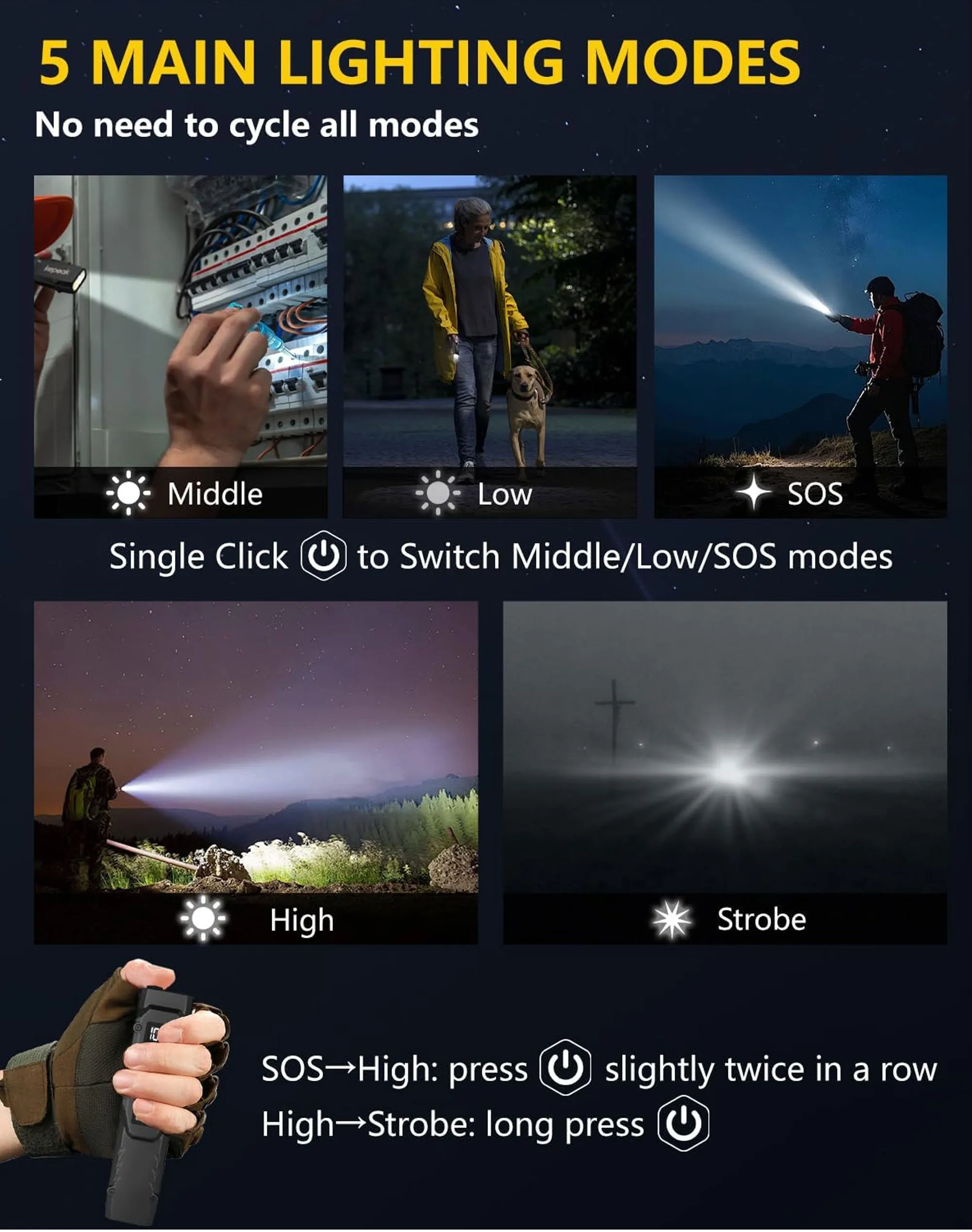 S1: Яркий — Тусклый — SOS; двойное нажатие — сверхъяркий свет; долгое нажатие — стробоскоп S2: Белый свет — Красный свет — УФ-свет; двойное нажатие — красный стробоскоп