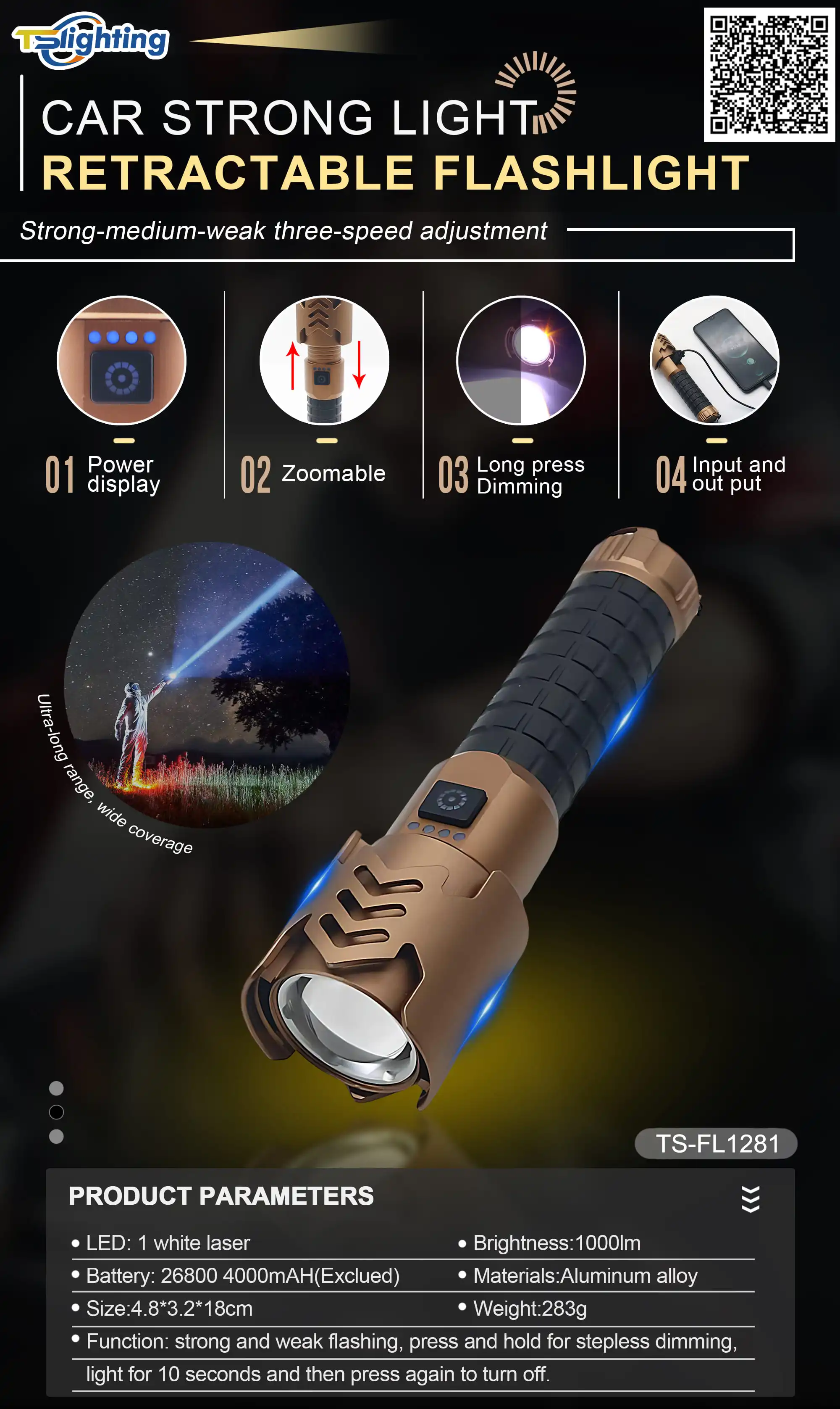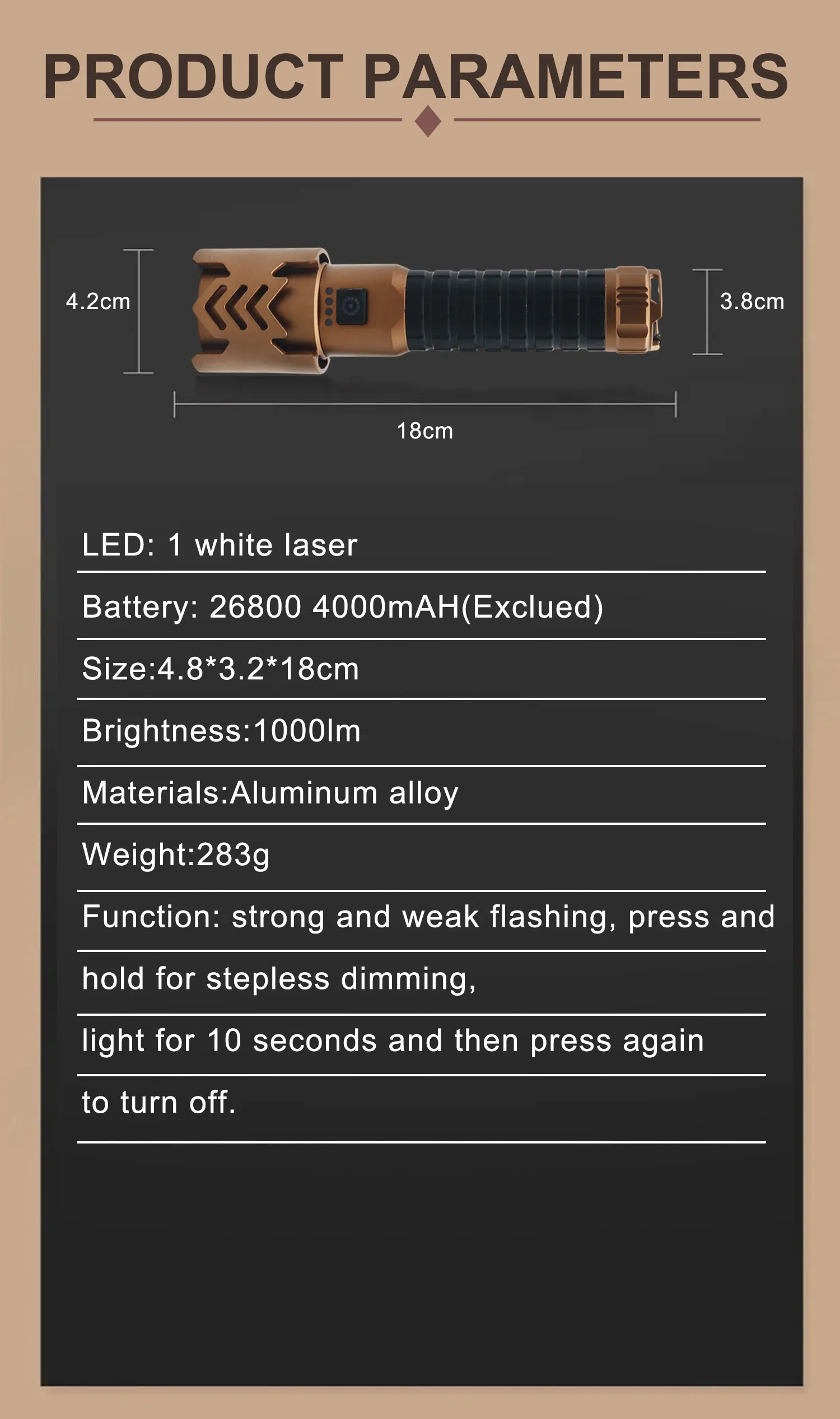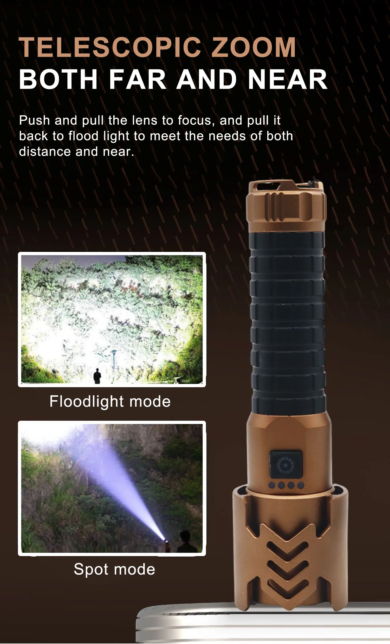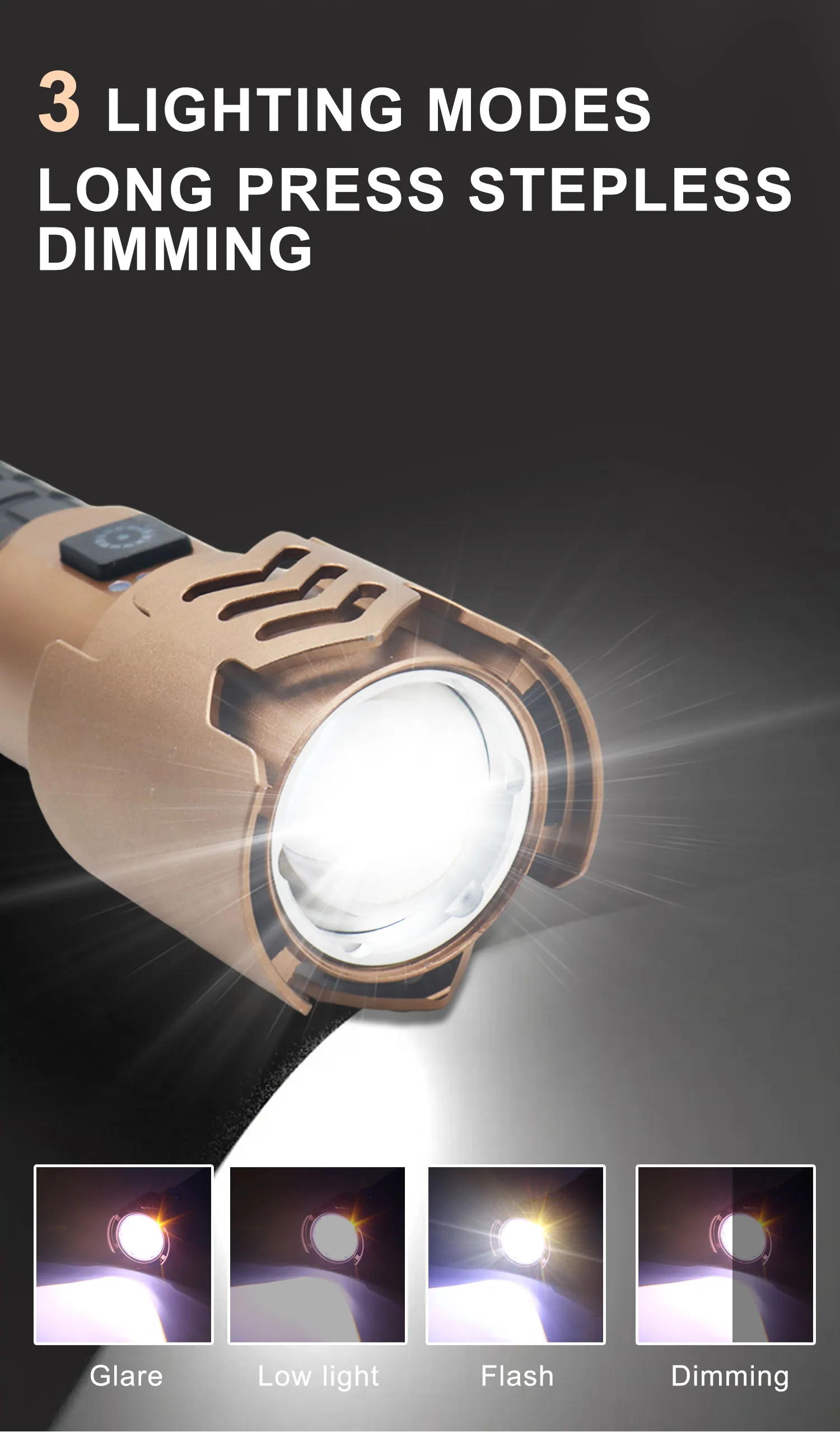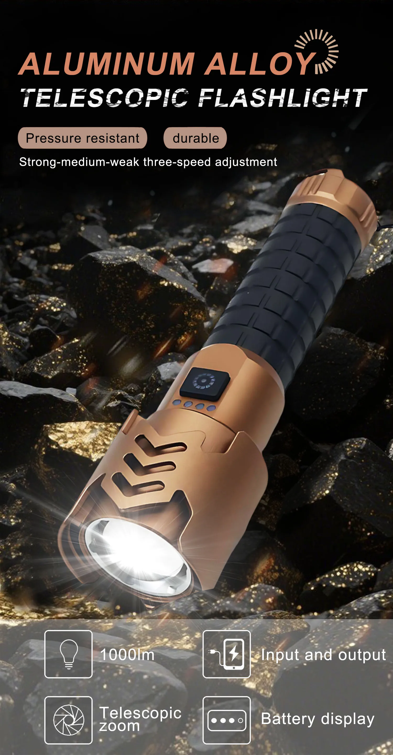 1. Индикатор уровня заряда батареи 2. Выход можно использовать как внешний аккумулятор 3. Плавная регулировка яркости 4. Мгновенное выключение: нажмите после 10 секунд работы 5. Световой поток 1000 лм, высокая яркость